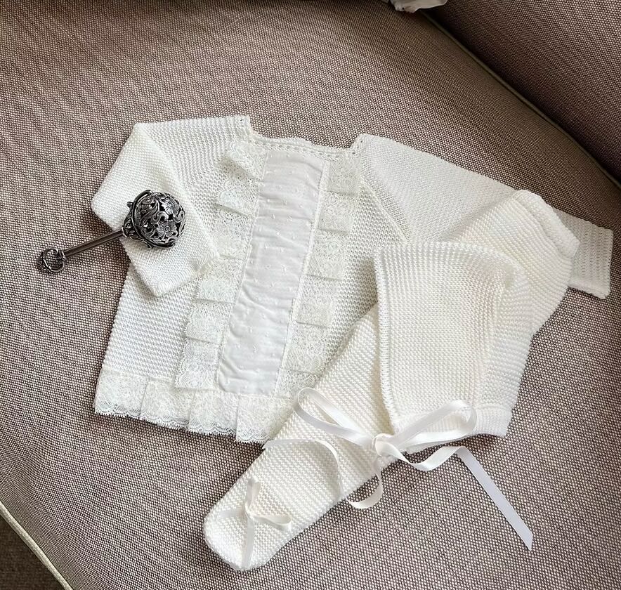 シンプルで美しいニットセットは上品なレースのディテールとフリルがアクセントに、男女問わずおめかしにぴったりのお品。